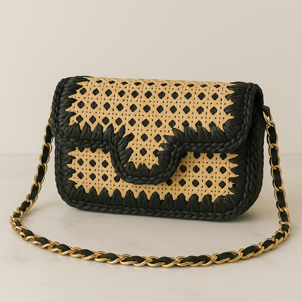 Sac en raphia noir et cannage beige.